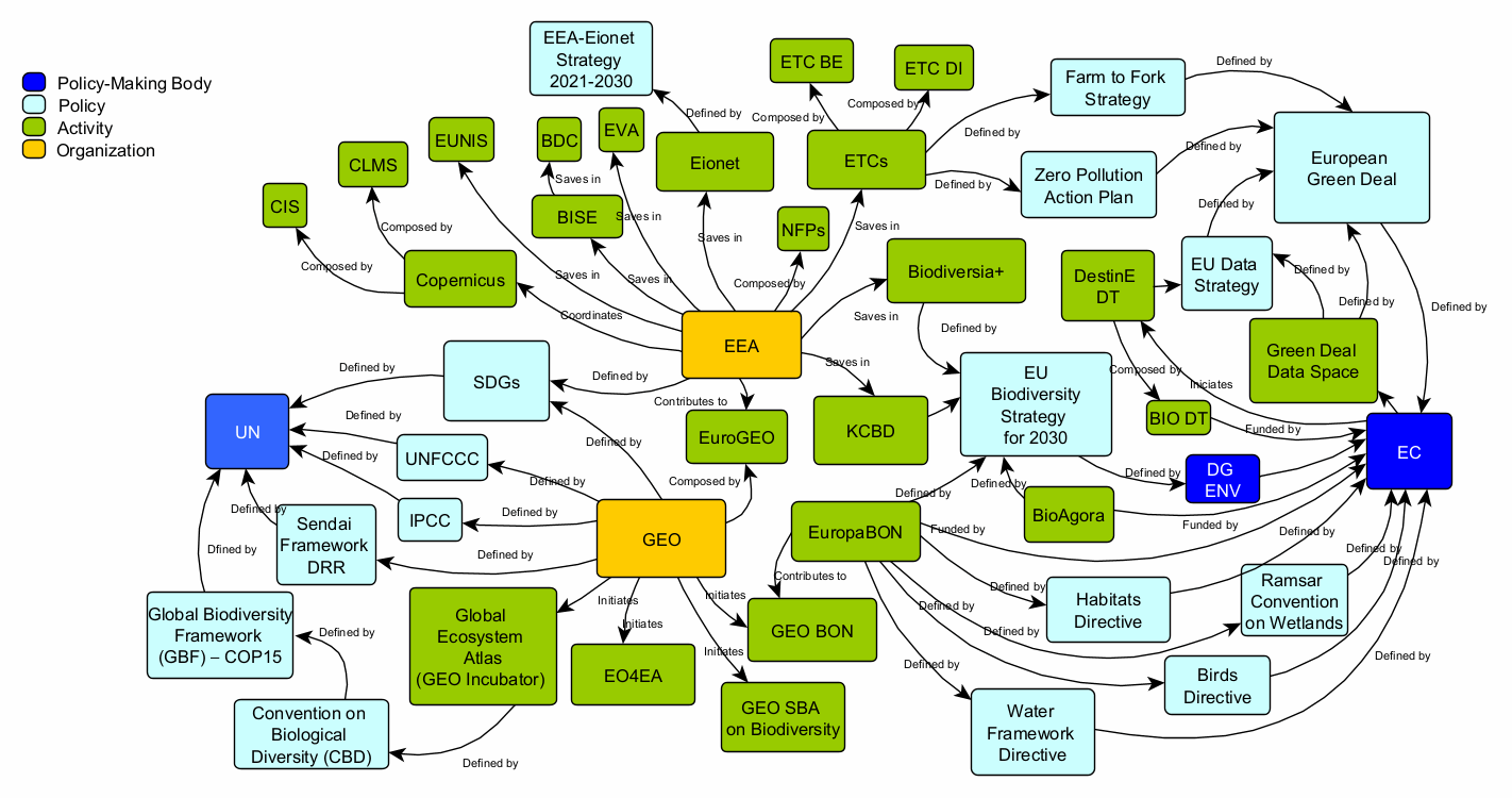 The dark-blue-colour boxes represent the main policy-making Bodies. The cyan-colour boxes represent the main Policies, both at EU and global level. The green-colour boxes represent the main Activities, including networks, programmes, information systems, data and knowledge centres, initiatives, flagships and research projects. The yellow-colour boxes represent the main Organizations managing or centralizing the activities regarding EO in-situ data, i.e, the EEA and the GEO.